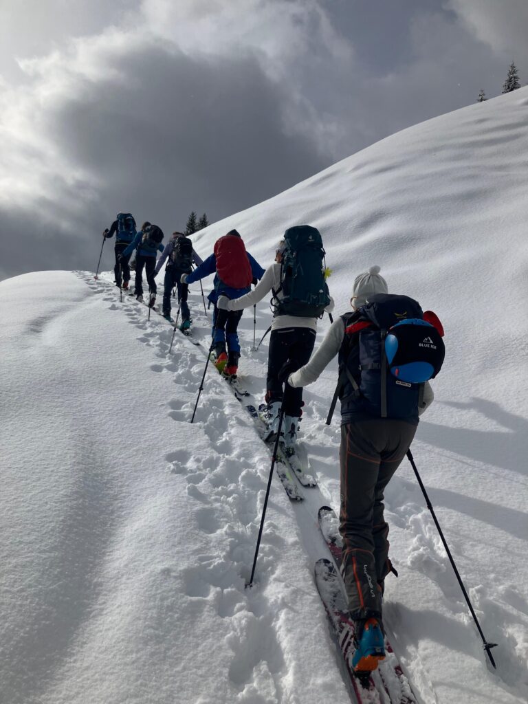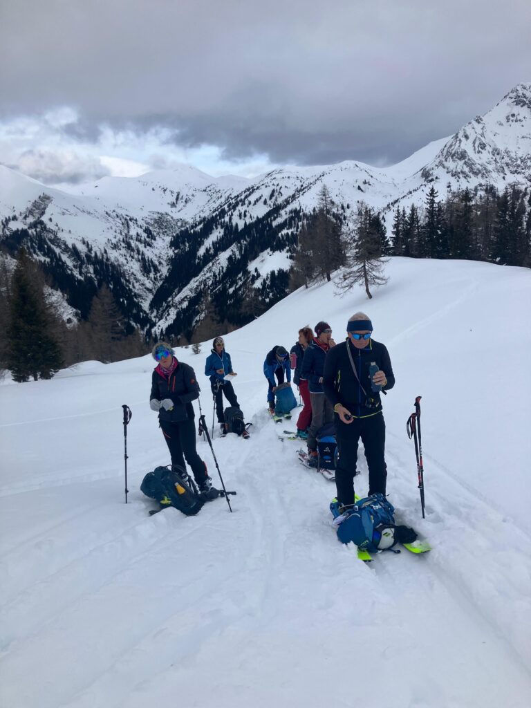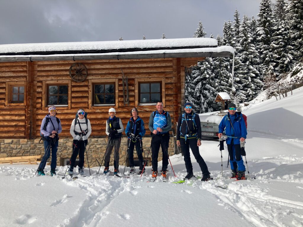 Neuschnee gab es vor und während der Schitourentage vom 20. Bis 24. Februar reichlich. Die Lawinenwarnstufe war für diesen Zeitraum auf 4 (große Lawinengefahr) gesetzt. Dennoch bietet das Großarltal trotz der hohen Warnstufe zahlreiche verhältnismäßig sichere Tourenmöglichkeiten. Wir wählten selbstverständlich eine passive Tourenwahl und Routenführung. So nutzten wir am Anreisetag die Schipiste für einen Aufstieg zum Kreuzkogel und nutzten die gemütliche Kreuzkogelhütte für eine erholsame Einkehr.