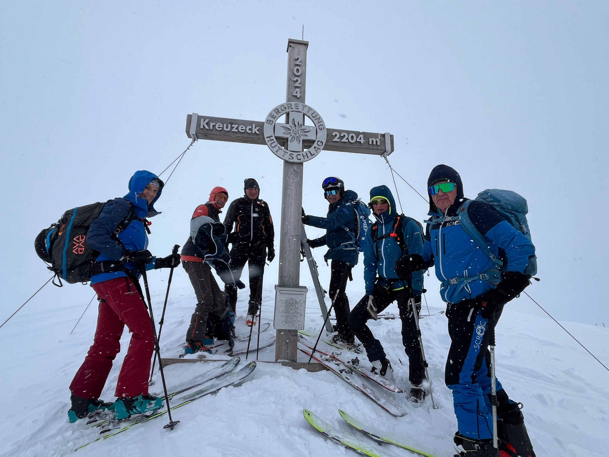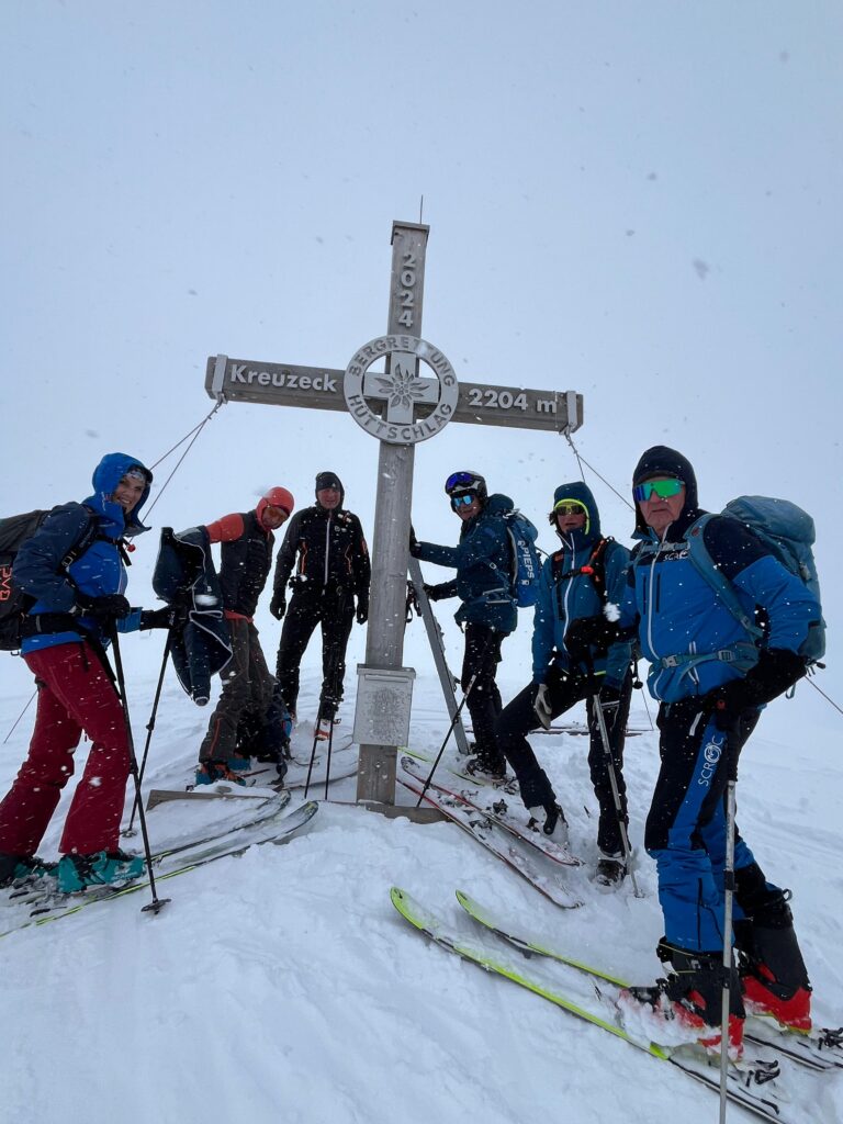 Am 4. Tag peilten wir den Hausberg von Hüttschlag, das Kreuzeck, an. Leider reichte das prognostizierte Schönwetterloch für Auf- und Abstieg nicht aus. Nach kurzem Umrüsten am Gipfelkreuz ging´s bei starkem Schneetreiben die ersten 100 Höhenmeter mehr oder weniger im Blindflug in den mittelsteilen Almboden. In der Zwischenzeit waren wir an die schwierigen Schneebedingungen gewöhnt und konnten sportliche Wedelschwünge bis zum Parkplatz der Hallmoosalm hinterlassen. Die verbliebene Freizeit nutzten wir nach einer kurzen Rekultivierung im Stallerhof zu einer kurzen Shoppingtour nach Großarl, bei der Damen und Herren im Intersport auf ihre Rechnung kamen.