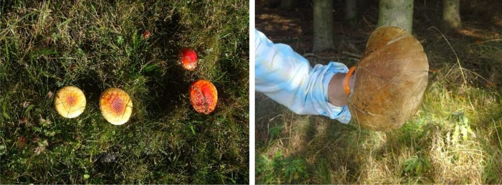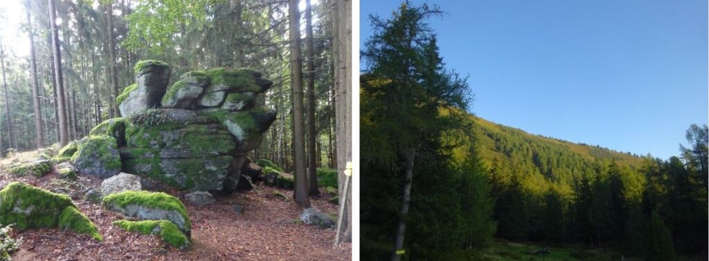 Am Leopoldschlager Berg (879 m) war Schluss mit der Bergaufschnauferei. Eine herrliche Herbststimmung – nicht nur im moosigen Wald – begleitete uns dann vorbei am „Opferstein“ bis Mardetschlag. Nicht nur Fliegenpilze, sondern tatsächlich auch Steinpilze, Parasole, Wiesenegerlinge und vereinzelt Eierschwammerl säumten den Weg, doch leider hatte niemand den typischen Schwammerlkorb dabei. Uns so wanderten halt nur ein paar wenige Exemplare, in Taschentücher gehüllt, in die viel zu kleinen Rucksäcke.